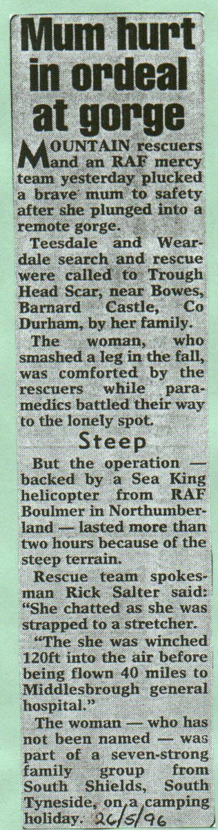 Back to index Back to 1996 "Mum hurt in ordeal at gorge". callout, Carol Myers, Trough Head Scar, RAF, successful.