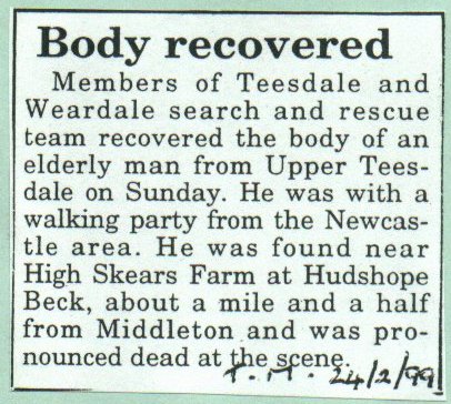Back to index Back to 1999 "Body recovered". callout, Hudshope Beck, Middleton, body recovery, fatality. DUPLICATE.